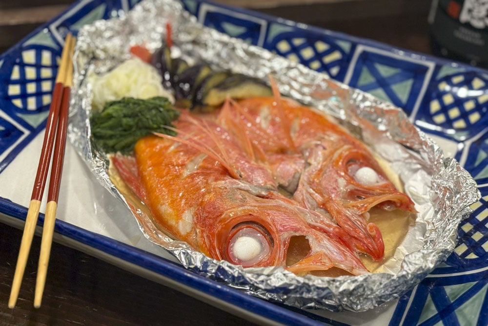 お刺身盛り合わせと馬刺しに加えて、金目鯛の姿蒸しをお付けしたとても豪勢なコースです。